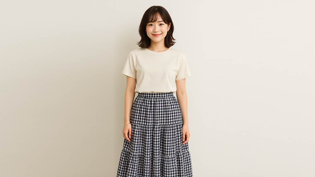 ボリューム感のあるスカートや柄ものもバランスよく着こなせます。