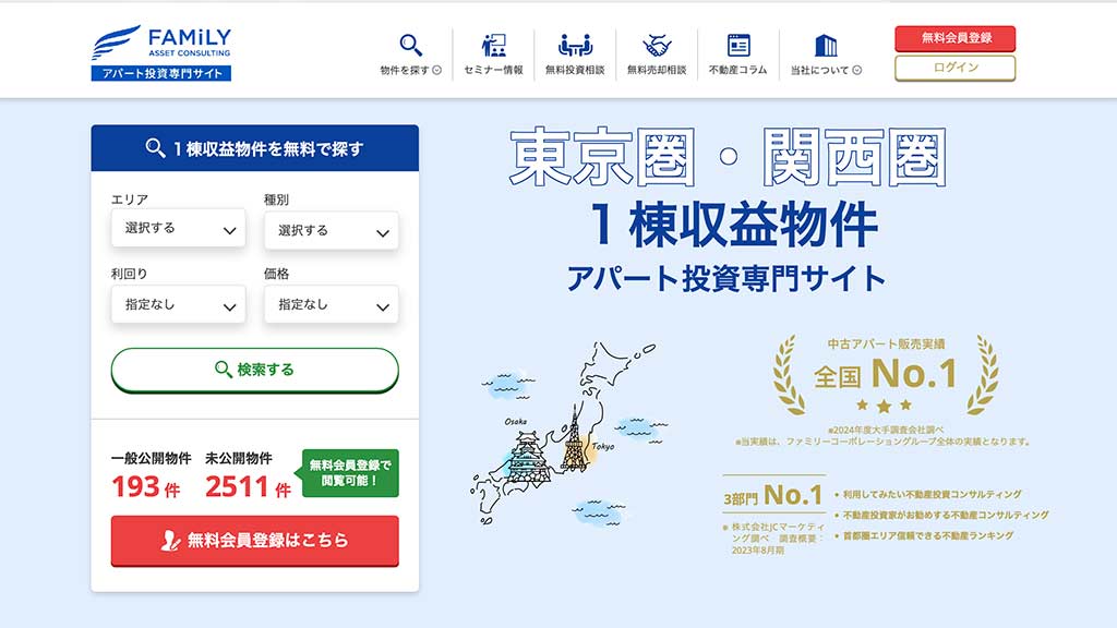 東京圏・関西圏を中心に、1棟収益物件を専門に扱うアパート投資特化型サイト。